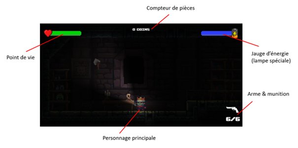The UI is composed of an health and energy barre, coin counter, and  the object in this hand.